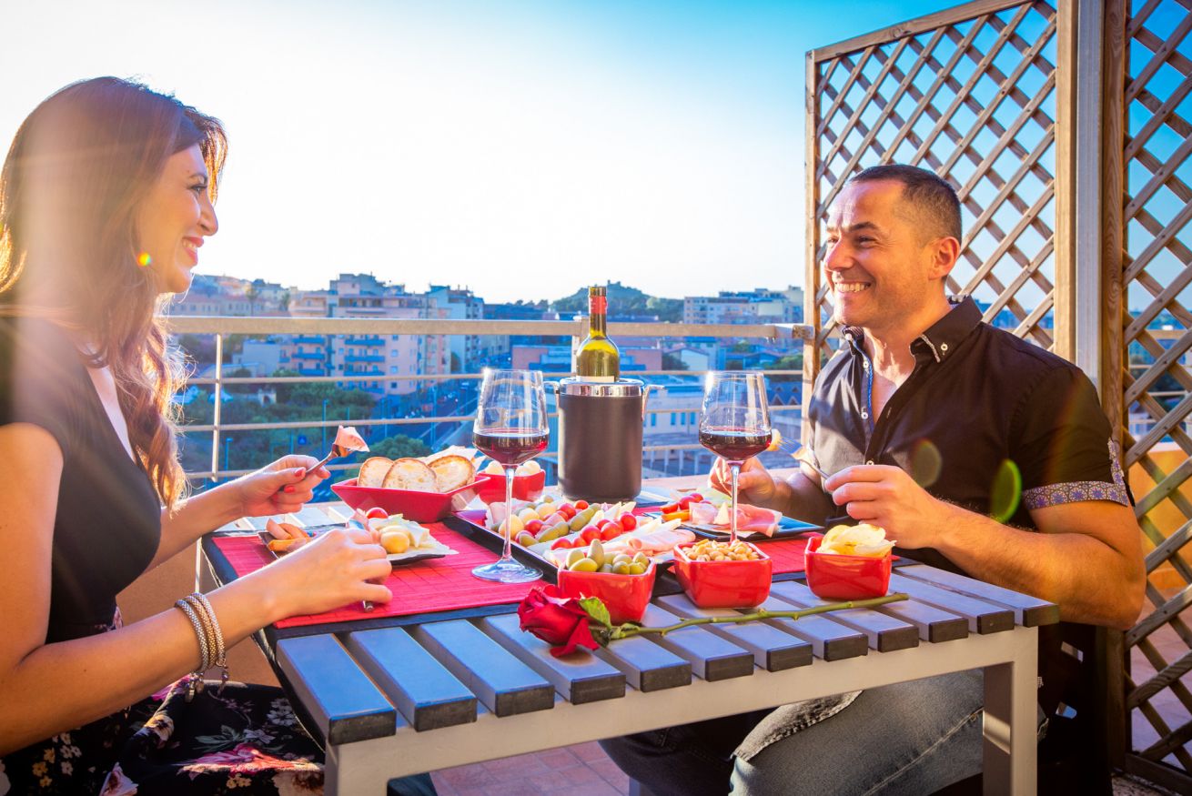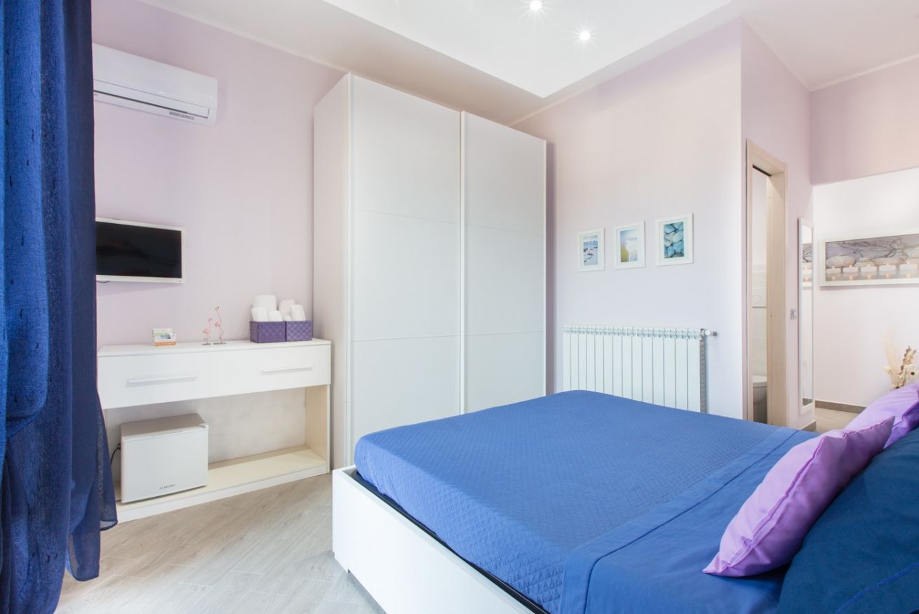 Camera matrimoniale. Terrazza privata panoramica con tavolo e due sedie, bagno in camera , colazione inclusa. Parcheggio privato opzionale al prezzo di 8€/giorno.