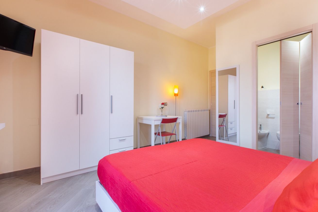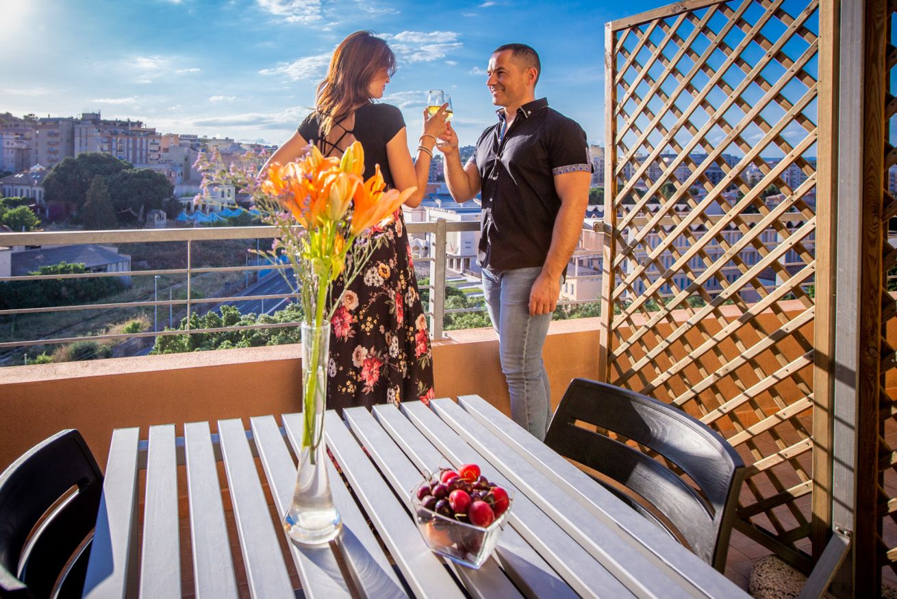 Camera matrimoniale. Terrazza privata panoramica con tavolo e due sedie, bagno privato in camera, colazione inclusa, parcheggio privato opzionale al prezzo di 8€/gg.